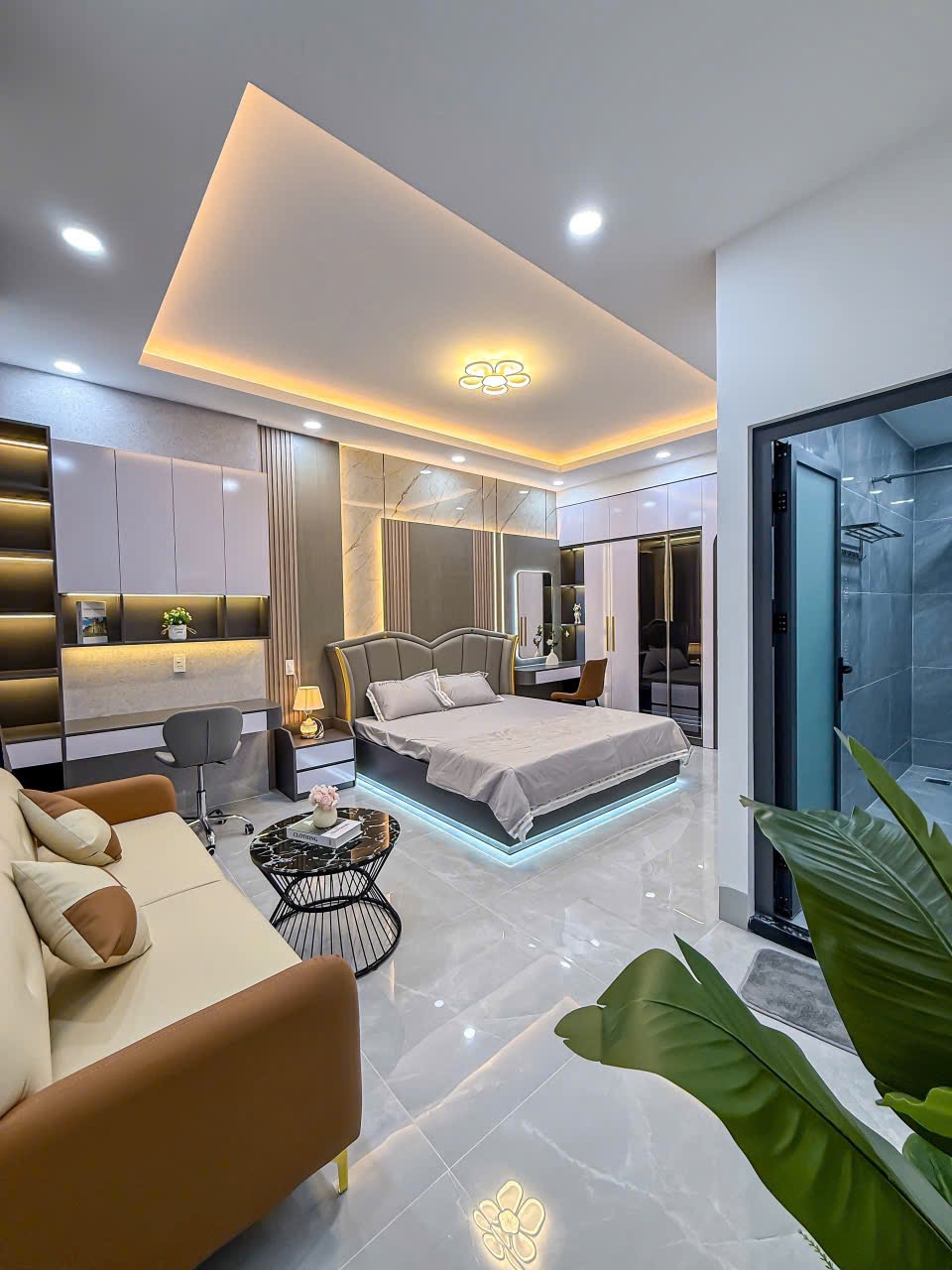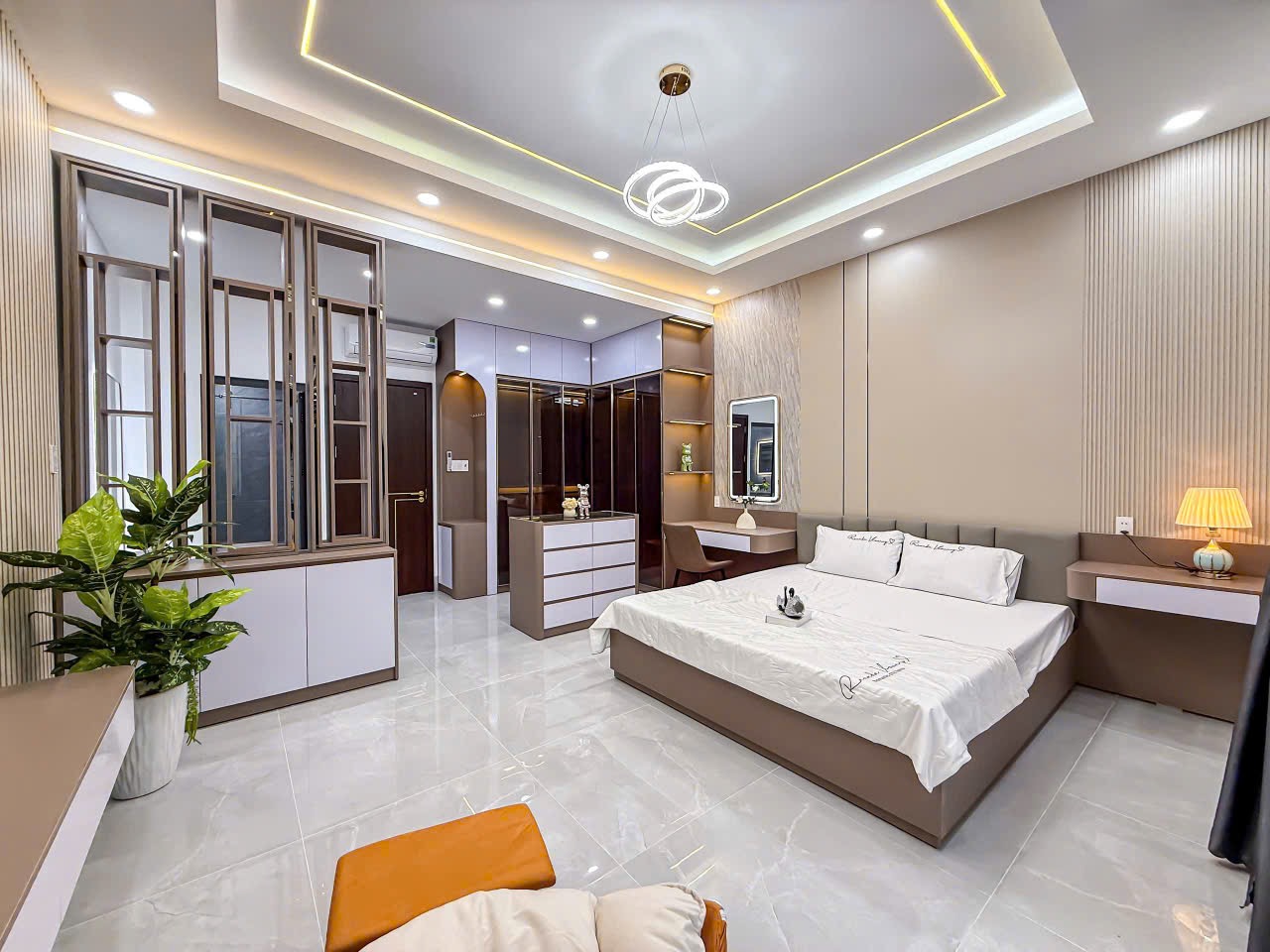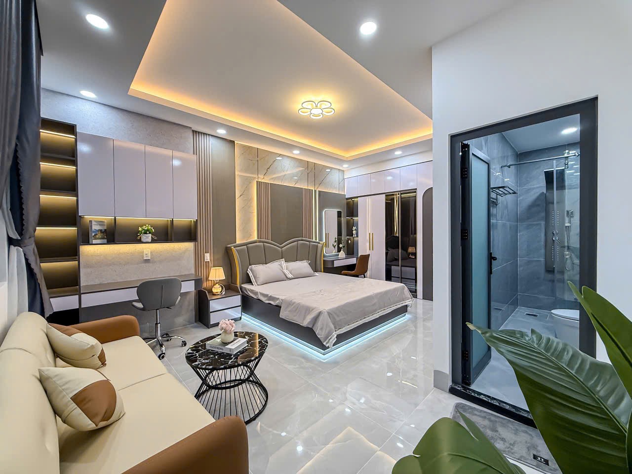 Nội thất sang trọng, cao cấp, sử dụng khoá: thẻ từ, vân tay, trang bị đầy đủ sofa, bàn ăn, tủ lạnh, tủ rượu, tủ áo, giường, nệm,...