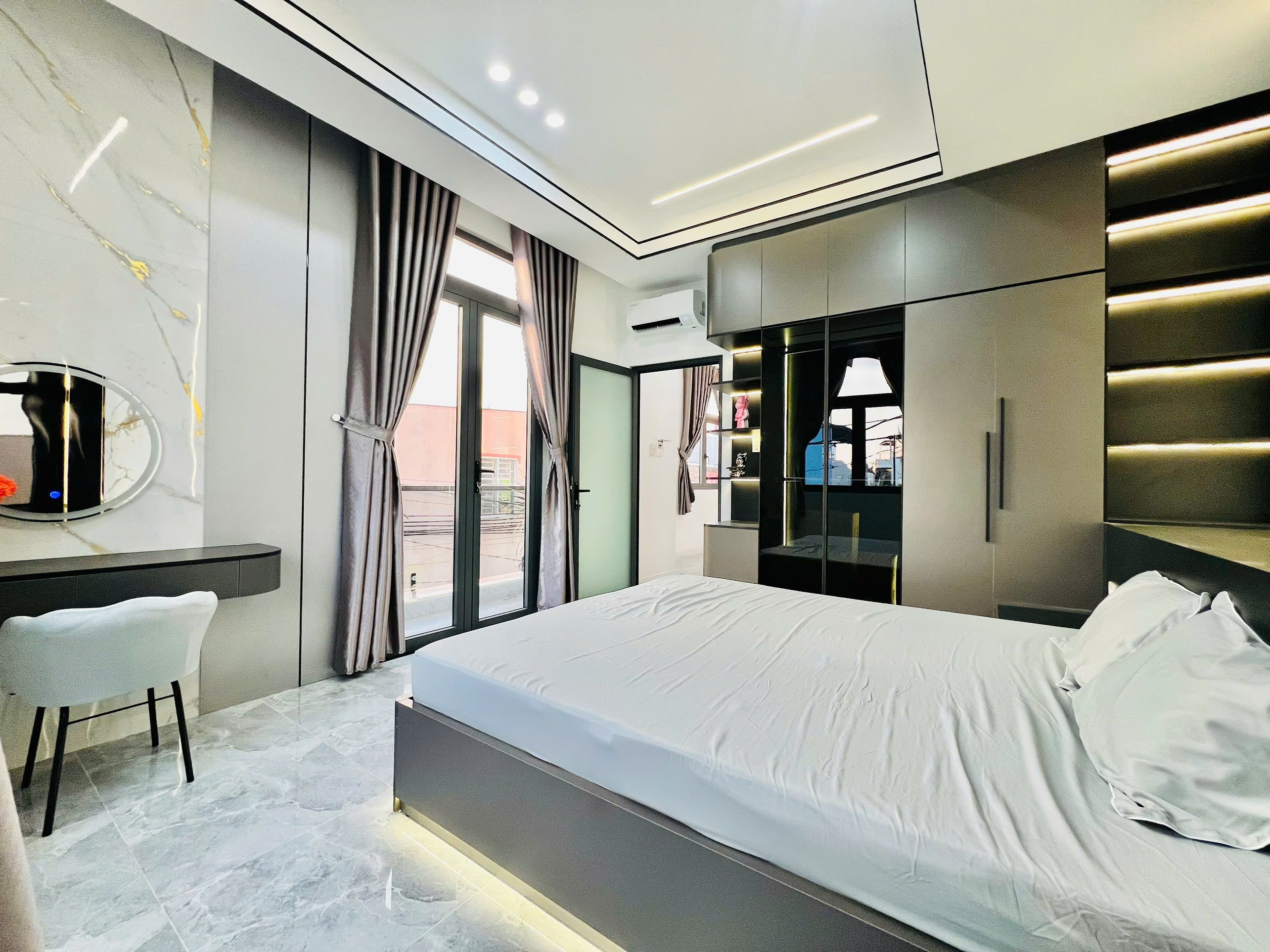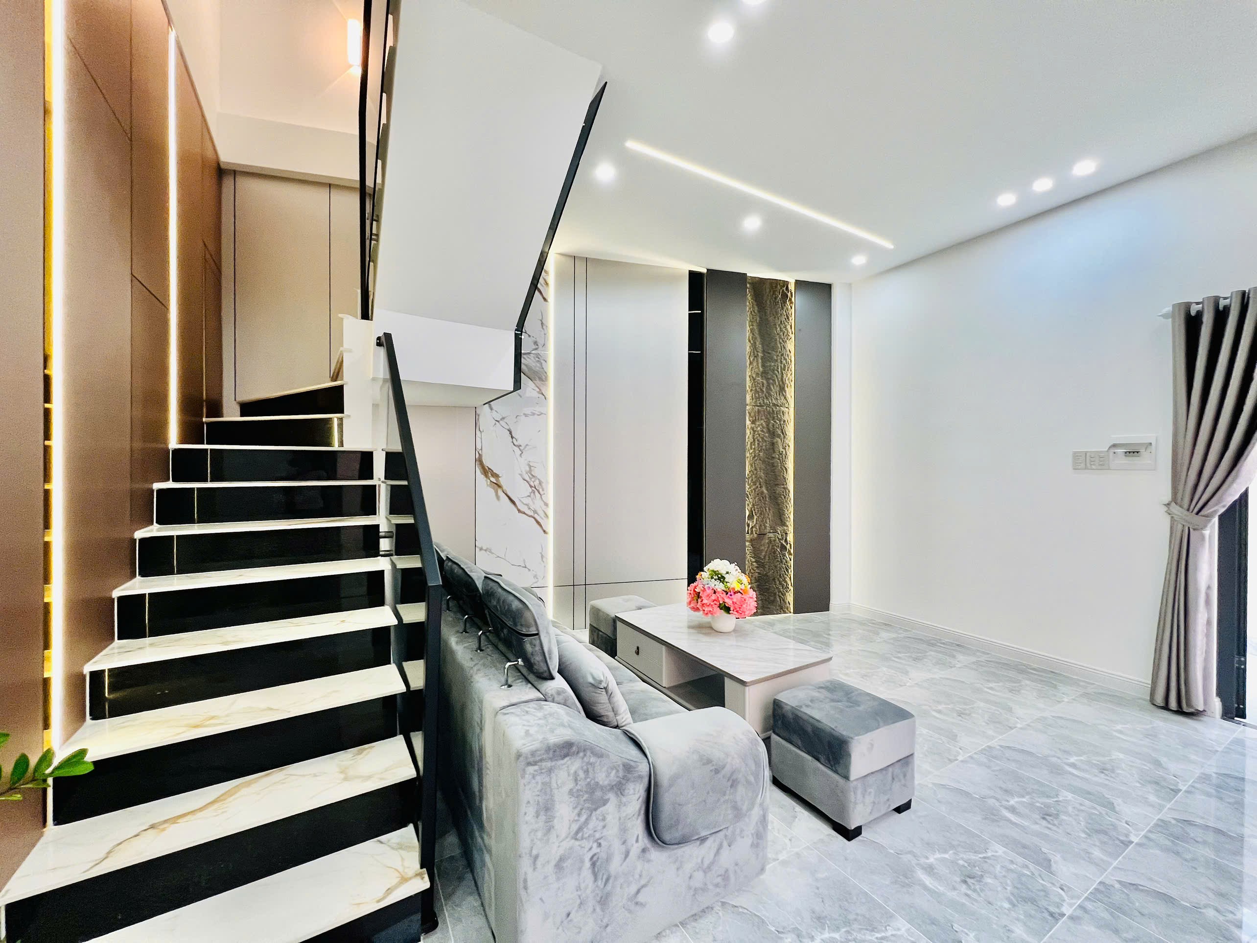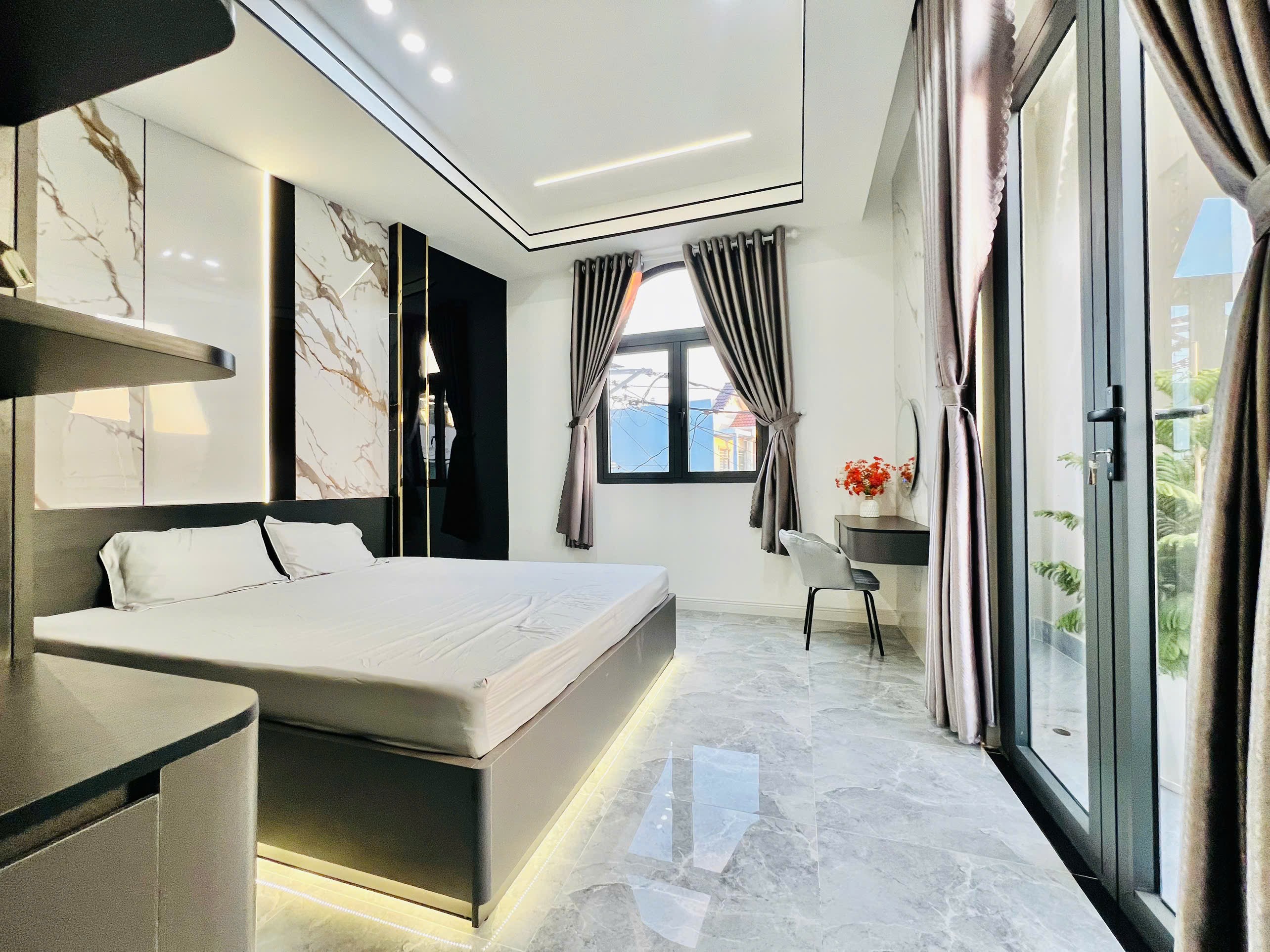 Nhà trang bị full nội thất :rèm full cửa , sofa phòng khách , 3 bộ giường nệm - tủ quần áo - bàn trang điểm, 3 điều hoà samsung inveter , máy nước nóng năng lượng , cây cảnh và phụ kiện trang trí .